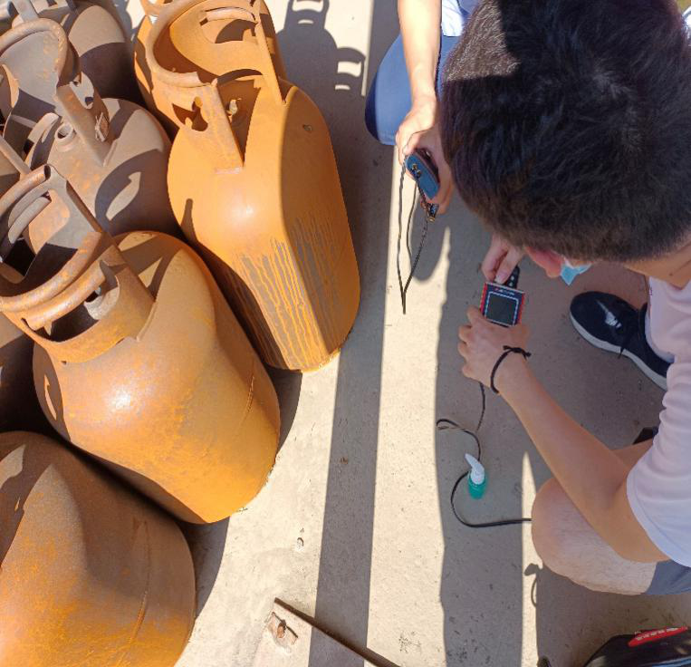 該單位為國(guó)企,是北京最大的液化氣罐維修廠。產(chǎn)品質(zhì)量關(guān)乎著千萬(wàn)商家和老百姓的人身財(cái)產(chǎn)安全。液化氣罐在除銹和噴涂工藝后,需對(duì)成品液化氣罐的壁厚進(jìn)行四點(diǎn)檢測(cè),確認(rèn)其達(dá)到新國(guó)標(biāo)2.5mm以上的標(biāo)準(zhǔn)。由于液化氣罐表面涂有油漆層,需要選用可穿透涂層的P5EE測(cè)厚探頭,并將測(cè)厚儀調(diào)至EE模式進(jìn)行測(cè)厚。操作步驟為:首先在普通模式下進(jìn)行零點(diǎn)校準(zhǔn),之后調(diào)至EE可穿透模式對(duì)成品液化氣罐加工成品進(jìn)行測(cè)量。試值精準(zhǔn)無誤。
