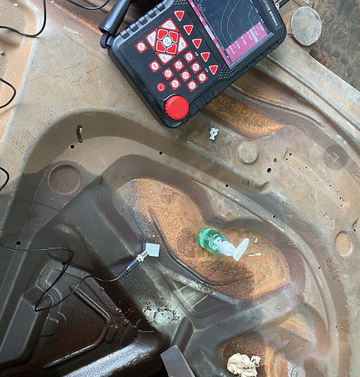 在一個廢棄模具上我們看到工件表面有一道明顯裂縫,李工想檢測一下裂縫深度。美泰工程師使用MUT550B超聲波探傷儀,匹配2.5MHz 9*9單晶斜探頭,對裂縫進行深度檢測。最后測得裂縫深度為35mm,李工對檢測檢測結(jié)果表示認(rèn)可。隨后又為客戶展示了MUT550B探傷儀匹配2.5MHz φ14單晶直探頭對其他工件進行檢測,測量結(jié)果也十分精確。