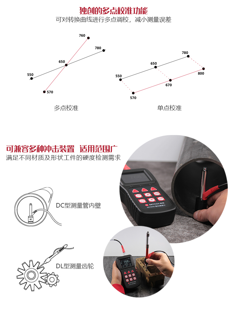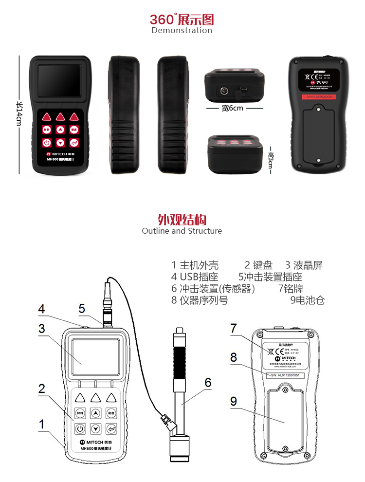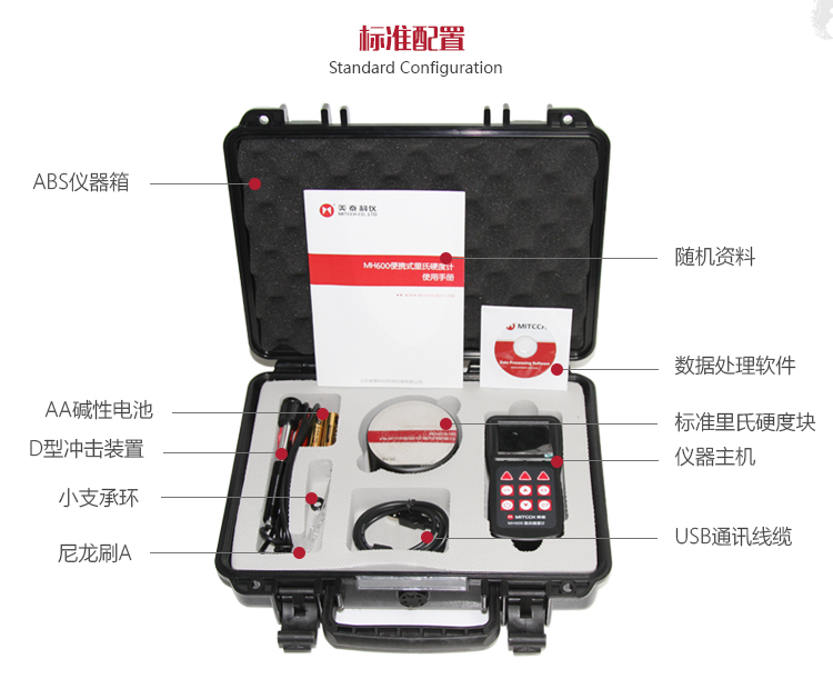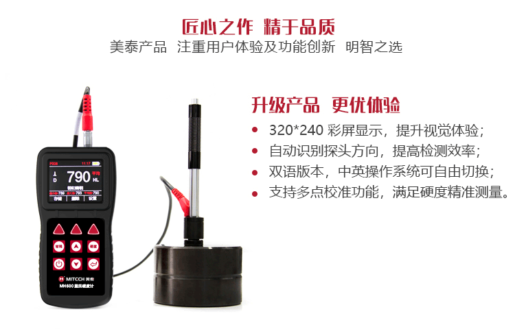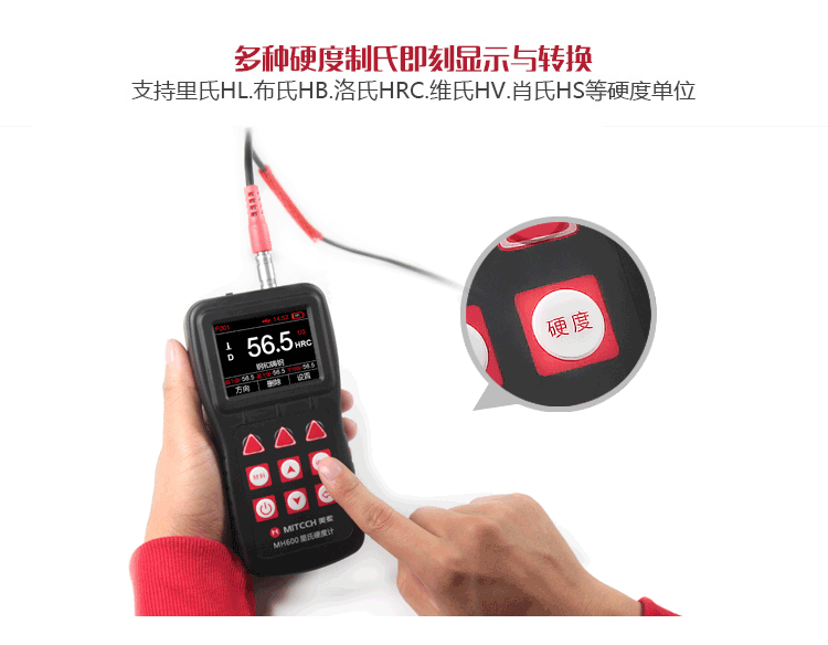 產(chǎn)品概述MH600便攜式里氏硬度計,智能化設(shè)計可方便快捷地現(xiàn)場檢測金屬硬度。IP65防護等級,可有效防御惡劣現(xiàn)場環(huán)境中的油污、粉塵及其它腐蝕;采用彩色液晶顯示屏,光線昏暗及日光強烈環(huán)境下也能為您呈現(xiàn)清晰測量結(jié)果,大大提升了視覺體驗;獨創(chuàng)的多點校準功能,可對轉(zhuǎn)換曲線進行多點調(diào)校,減小測量誤差;測量中儀器可自動識別測量方向,超出設(shè)定范圍自動報警、可語音播報測量結(jié)果,滿足高效采集多角度材料的精準檢測需求,支持多種硬度制氏間的自由轉(zhuǎn)換;低功耗設(shè)計由兩節(jié)AA五號電池供電,支持多種語言版本切換。被廣泛地應用于金屬加工制造業(yè)、特種設(shè)備或永久性組件的在役失效分析、商檢等領(lǐng)域。特別適宜對大型不可拆卸部件的現(xiàn)場硬度測試。是提高生產(chǎn)合格率、節(jié)約成本必備的專業(yè)精密儀器。