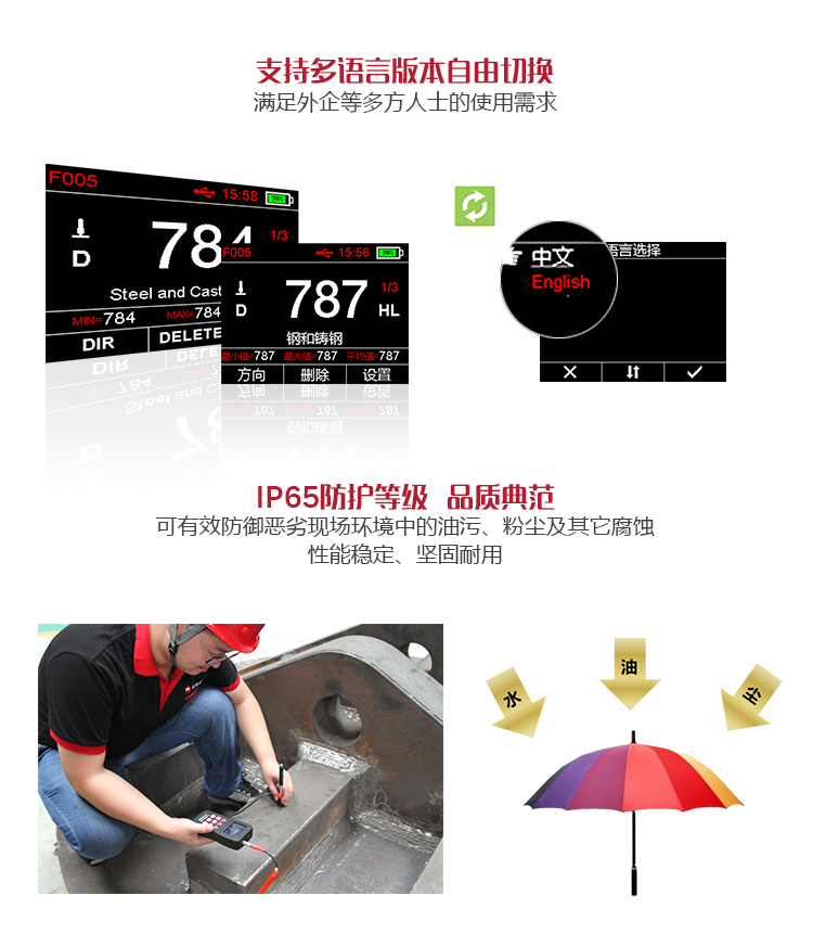 | 單位制式 | 里氏(HL)、布氏(HB)、洛氏B(HRB)、洛氏C(HRC)、洛氏A(HRA)、維氏(HV)、肖氏(HS) |