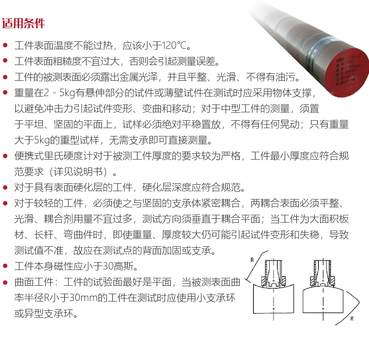 只有重大于5kg的重型試樣,無需支承即可直接測量。便攜式里氏硬度計對于被測工件 厚度的要求較為嚴格,工件最小厚度應符合說明書規(guī)范要求。