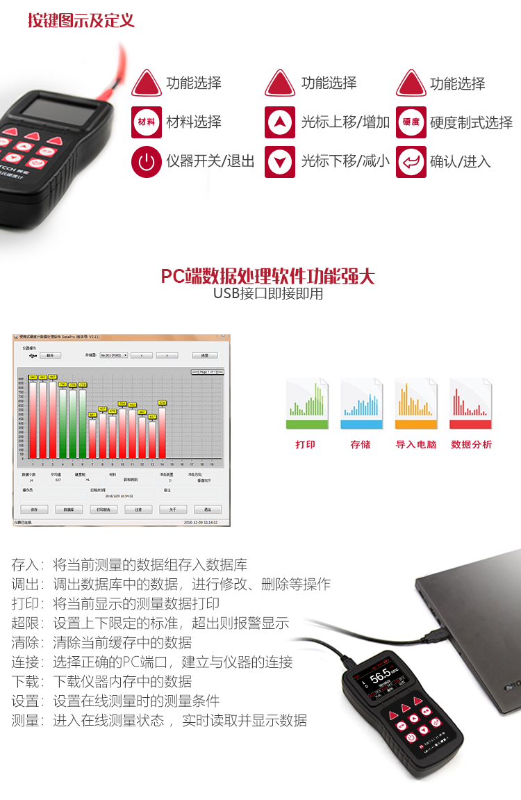 設(shè)有USB接口,通過PC端數(shù)據(jù)處理軟件,可傳輸測量結(jié)果、測值存儲管理、測值統(tǒng)計分析、打印測值報告、批量設(shè)定儀器參數(shù)等,滿足質(zhì)量保證和管理的更高需求