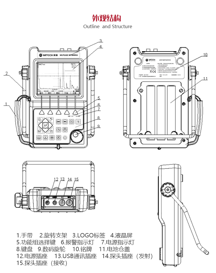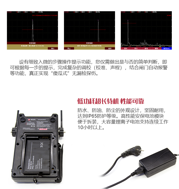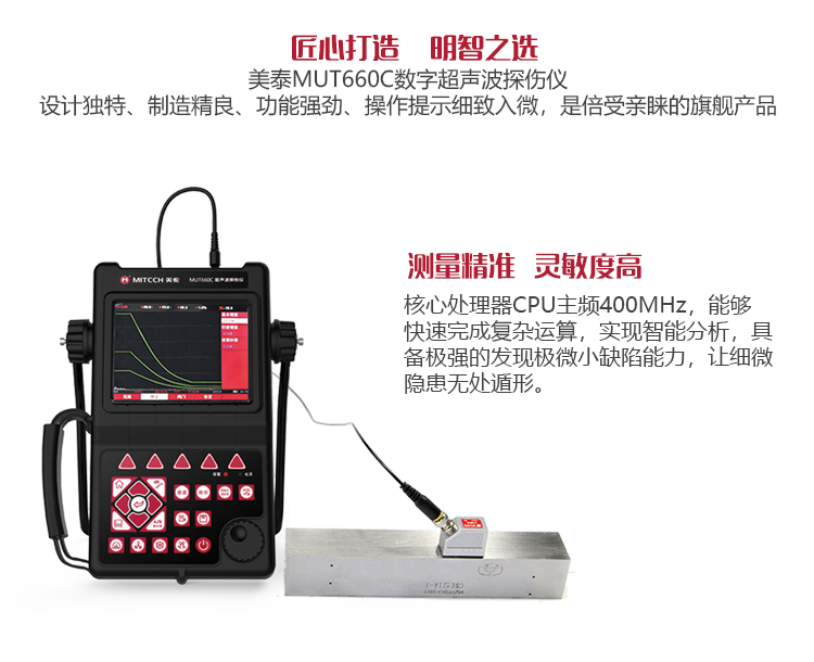 產(chǎn)品概述MUT660C智能數(shù)字式超聲波探傷儀是美泰公司專注多年精心研制的旗艦產(chǎn)品,其設(shè)計獨特、制造精良、操作便捷、功能強勁,集諸多優(yōu)勢于一身,自問世以來一直倍受用戶親睞,它能夠快速便捷、無損傷、精確地進行工件內(nèi)部多種缺陷(裂紋、夾雜、氣孔等)的檢測、定位、評估和診斷。采用全數(shù)字TFT 640×480真彩色液晶顯示屏,可根據(jù)環(huán)境選擇操作界面風(fēng)格,液晶亮度可調(diào)節(jié),界面設(shè)計人性化、波形顯示細(xì)膩;可全屏清晰發(fā)現(xiàn)缺陷;單手可把持操作,曲線制作、探頭校準(zhǔn)等常規(guī)操作均可自動完成;核心處理器CPU主頻400M,能快速完成復(fù)雜運算,實現(xiàn)智能缺陷分析;低功耗設(shè)計配備大容量高性能鋰離子電池模塊可連續(xù)工作10小時以上;全中文主從式菜單,注重用戶體驗,集快捷按鍵、數(shù)碼飛梭旋輪、十字菜單三種操作方式于一體,不同使用習(xí)慣均可操作自如;支持多語言。防水、防油、防塵可達(dá)到IP65防護等級。是石油、化工、冶金、造船、航空、鐵路等領(lǐng)域缺陷檢測、質(zhì)量控制、在役安全監(jiān)測與壽命評估必備的專業(yè)精密儀器。