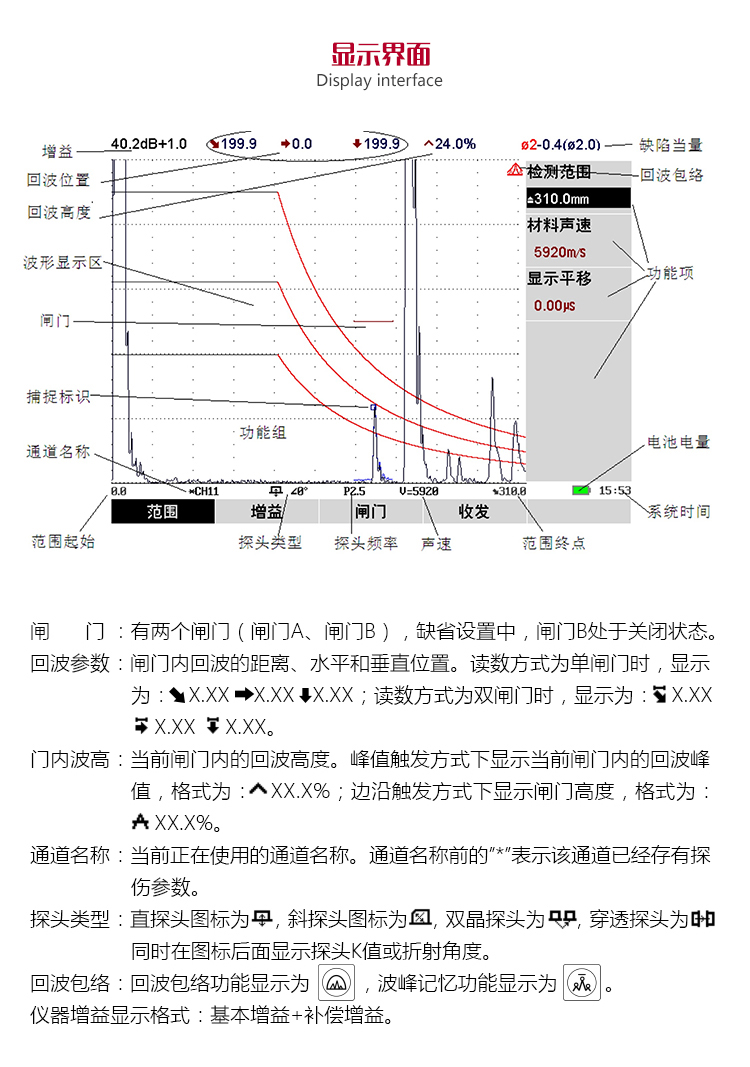 | 回波編碼 | 以不同顏色顯示1~6次回波顯示區(qū),便于判斷缺陷位置 |