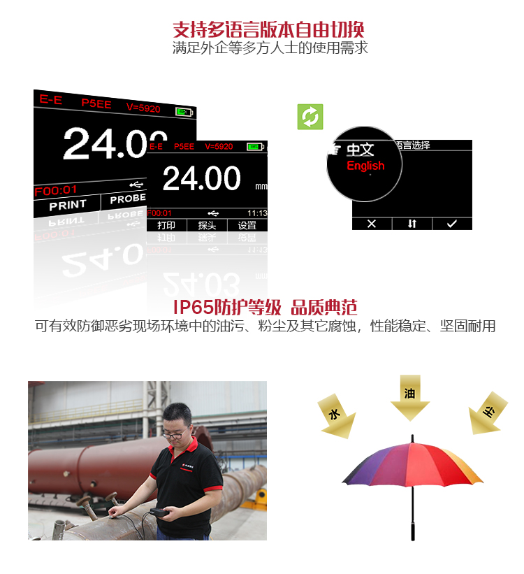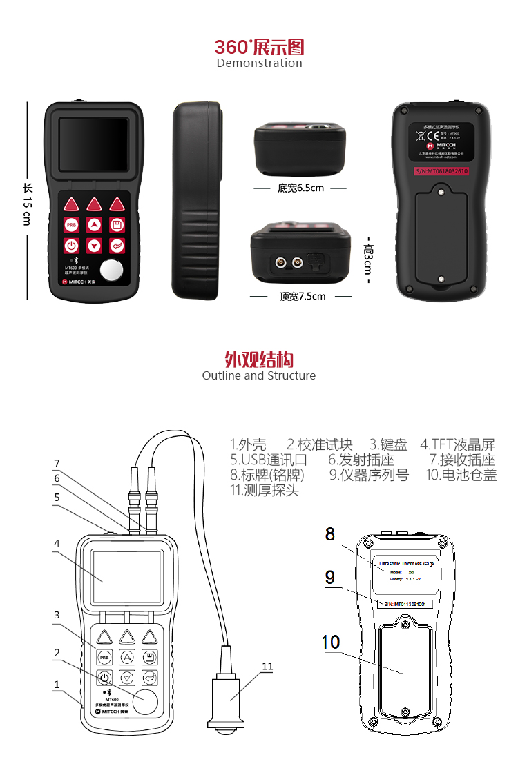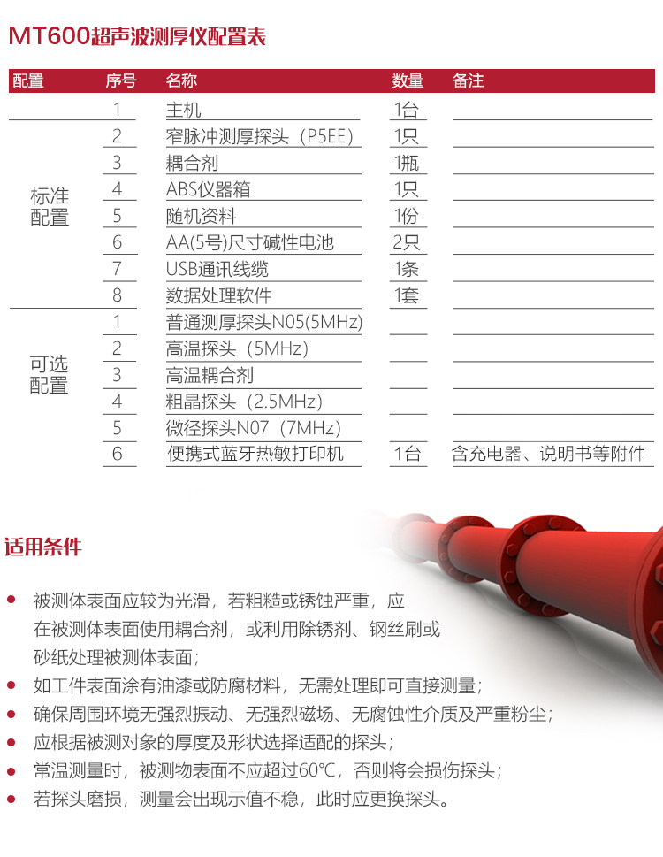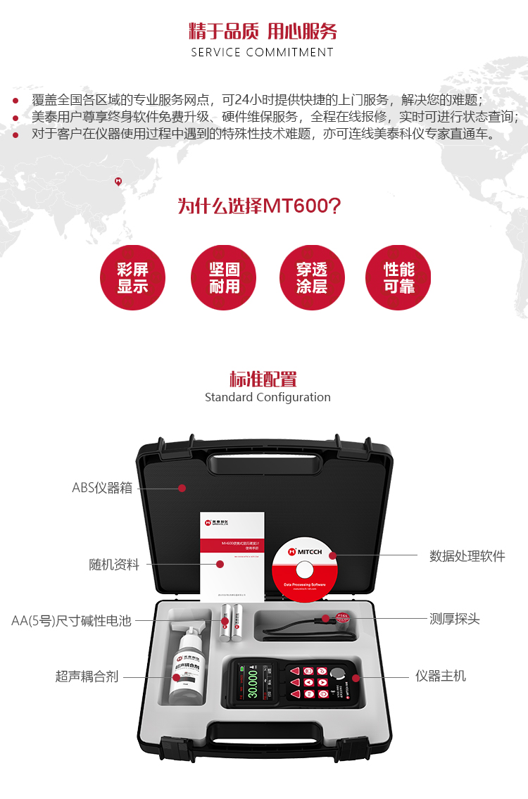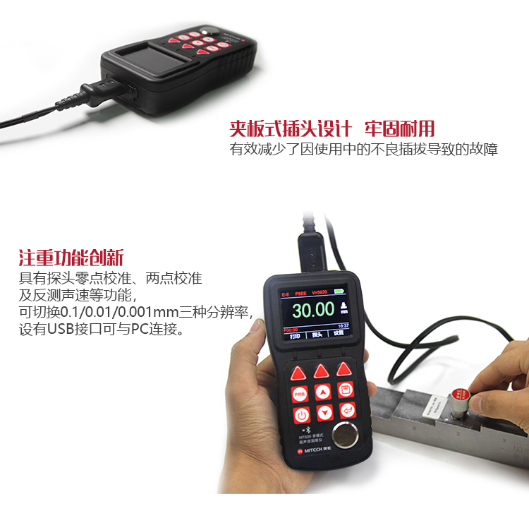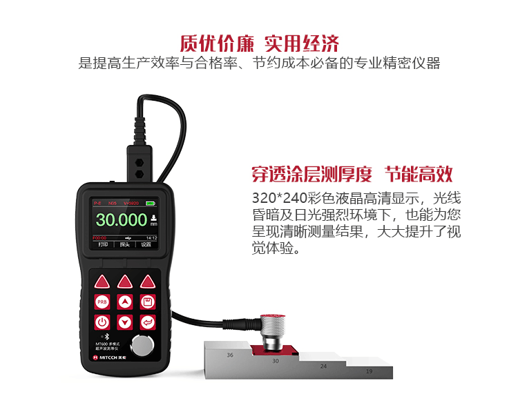 產(chǎn)品概述MT600超聲波測厚儀是美泰公司強(qiáng)力推出的升級產(chǎn)品,它更加注重用戶體驗(yàn)及功能創(chuàng)新,采用320×240彩色液晶顯示屏,光線昏暗及日光強(qiáng)烈環(huán)境下也能為您呈現(xiàn)清晰測量結(jié)果,大大提升了視覺體驗(yàn),IP65防護(hù)等級,可有效防御惡劣現(xiàn)場環(huán)境中的油污、粉塵及其它腐蝕;創(chuàng)新設(shè)計(jì)的語言播報(bào)測量結(jié)果功能,可方便讀數(shù),超出設(shè)定范圍可自動報(bào)警,滿足高效采集材料多點(diǎn)厚度的精準(zhǔn)檢測需求,支持0.001高精度顯示、藍(lán)牙通訊,兼?zhèn)浯┩竿繉幽J脚c普通模式雙效功能,其獨(dú)特的可穿透涂層測厚度的性能為表面涂有油漆或防腐材料的工件厚度檢測提供了更加高效的解決方案,測量前無需處理掉表面的涂層,可直接測量。被廣泛應(yīng)用于石油、化工、冶金、造船、航空、航天等領(lǐng)域的生產(chǎn)設(shè)備中各種管道及壓力容器腐蝕減薄程度的監(jiān)測,也可用于對各種板材及各種加工零件做精確的測量。是提高生產(chǎn)效率與合格率、節(jié)約成本必備的專業(yè)精密儀器。