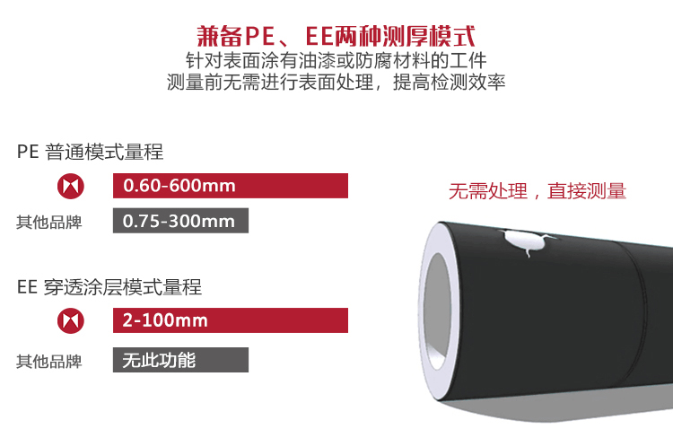 兼?zhèn)鋬煞N測厚模式:發(fā)射-回波模式和回波-回波模式,可以穿透涂層進(jìn)行厚度測量而不計(jì)入涂層厚度