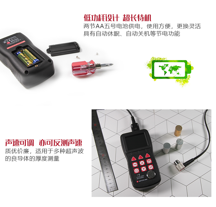 | 美泰系列超聲波測厚儀,均采用低功耗設(shè)計(jì)理念,超長待機(jī),MT150/MT160/MT200/MT180/MT192/MT280/MT600/MT660均由兩節(jié)AA五號電池供電、更換方便。 | |