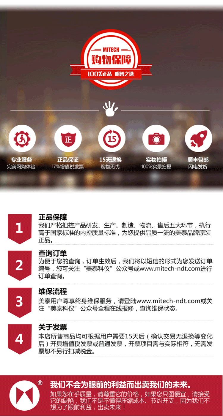 | 美泰系列便攜式超聲波測厚儀附有專用的隨機(jī)裝箱資料。包括產(chǎn)品合格證、保修卡、產(chǎn)品說明書、裝箱清單。隨機(jī)資料采用專用的銅版紙印制,說明書圖文設(shè)計(jì),美觀、易懂、便于長久保存。注:美泰品牌系列產(chǎn)品的隨機(jī)資料均可登陸www.zg6899.com下載電子版。 | |