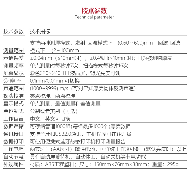 | 存儲 | 可存儲管理100組(每組最多100個(gè))厚度數(shù)據(jù) |