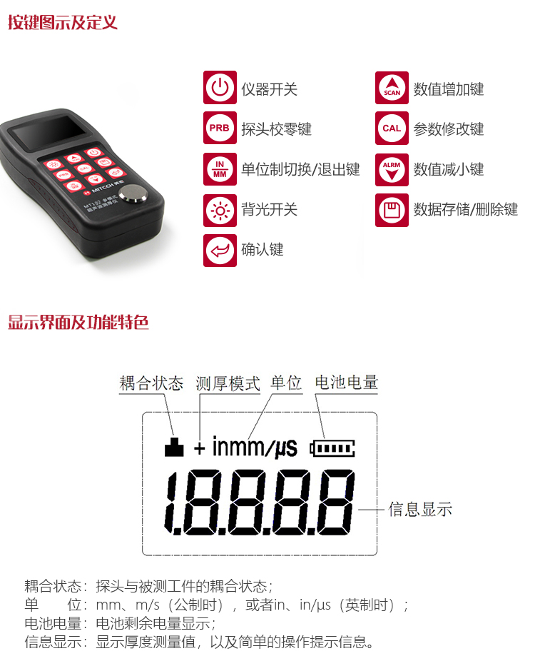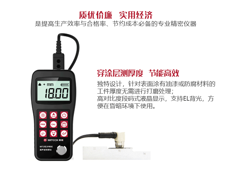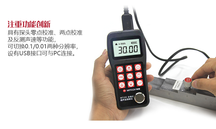 產(chǎn)品概述美泰MT192超聲波測厚儀,基于超聲波測量原理,可對(duì)金屬、塑料、陶瓷、玻璃及其他多種超聲波的良導(dǎo)體材料進(jìn)行厚度測量,也可實(shí)現(xiàn)對(duì)材料聲速的反測。與傳統(tǒng)的測量方法相比,超聲波測厚儀的優(yōu)勢(shì)在于它只要接觸到被測工件的一面即可完成測量,其獨(dú)特的可穿透涂層測厚度的性能為表面涂有油漆或防腐材料的工件厚度檢測提供了更加高效的解決方案,測量前無需處理掉表面的涂層,可以直接測量。被廣泛應(yīng)用于石油、化工、冶金、造船、航空、航天等領(lǐng)域的生產(chǎn)設(shè)備中各種管道及壓力容器腐蝕減薄程度的監(jiān)測,也可用于對(duì)各種板材及各種加工零件做精確的測量。是提高生產(chǎn)效率與合格率、節(jié)約成本必備的專業(yè)精密儀器。