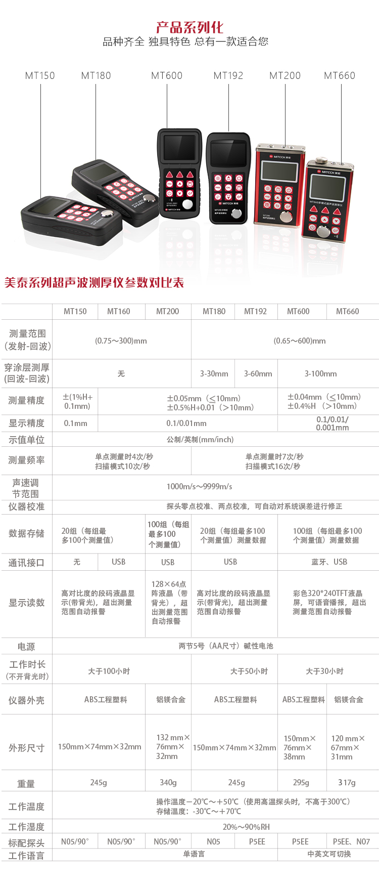 | 美泰系列超聲波測厚儀,均采用低功耗設(shè)計(jì)理念,超長待機(jī),MT150/MT160/MT200/MT180/MT192/MT280/MT600/MT660均由兩節(jié)AA五號(hào)電池供電、更換方便。 | |