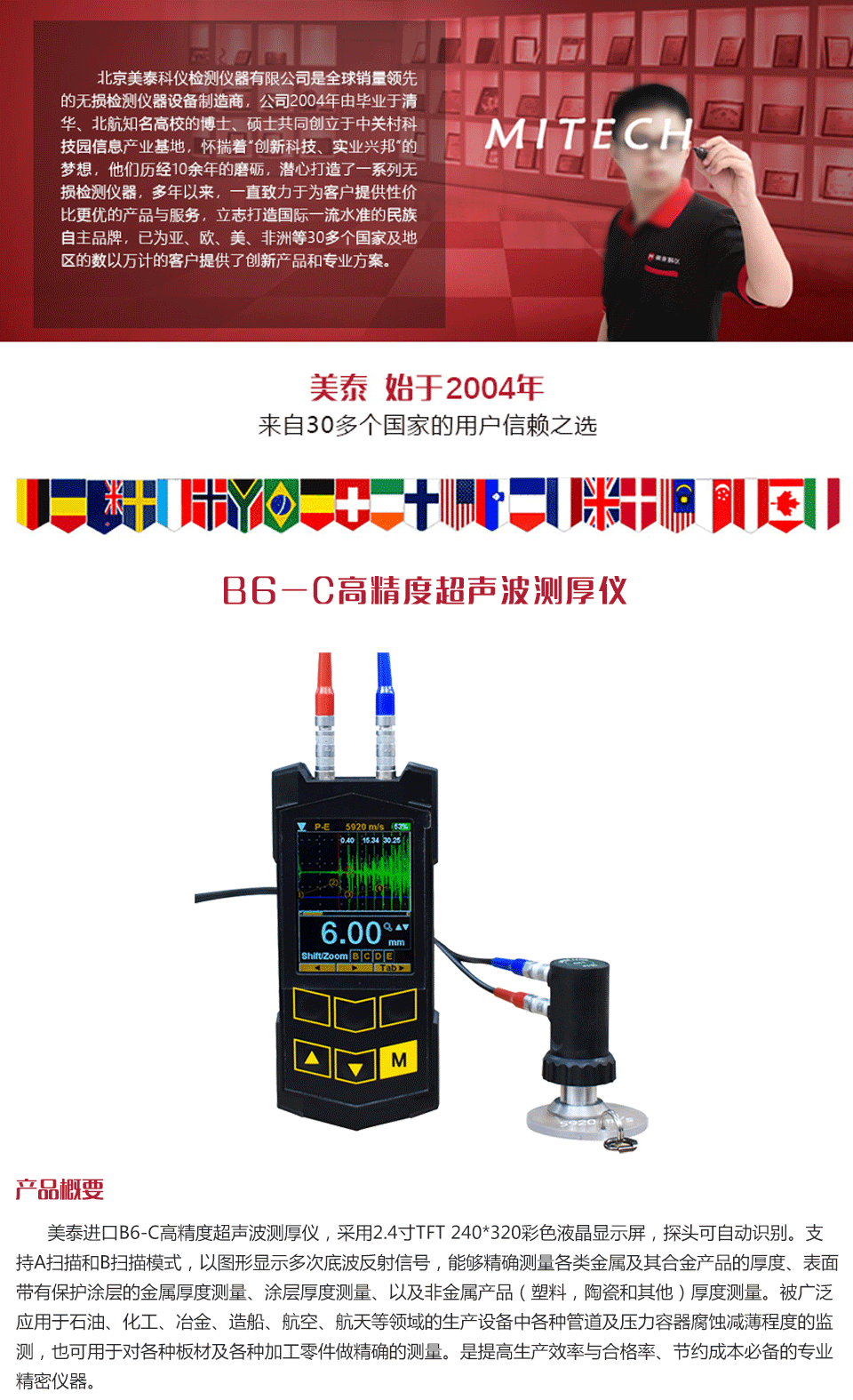 美泰進(jìn)口B6-C高精度超聲波測(cè)厚儀,采用2.4寸TFT 240*320彩色液晶顯示屏,探頭可自動(dòng)識(shí)別。支持A掃描和B掃描模式,以圖形顯示多次底波反射信號(hào),能夠精確測(cè)量各類(lèi)金屬及其合金產(chǎn)品的厚度、表面帶有保護(hù)涂層的金屬厚度測(cè)量、涂層厚度測(cè)量、以及非金屬產(chǎn)品(塑料,陶瓷和其他)厚度測(cè)量。被廣泛應(yīng)用于石油、化工、冶金、造船、航空、航天等領(lǐng)域的生產(chǎn)設(shè)備中各種管道及壓力容器腐蝕減薄程度的監(jiān)測(cè),也可用于對(duì)各種板材及各種加工零件做精確的測(cè)量。是提高生產(chǎn)效率與合格率、節(jié)約成本必備的專(zhuān)業(yè)精密儀器。