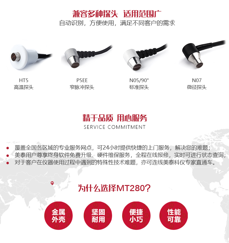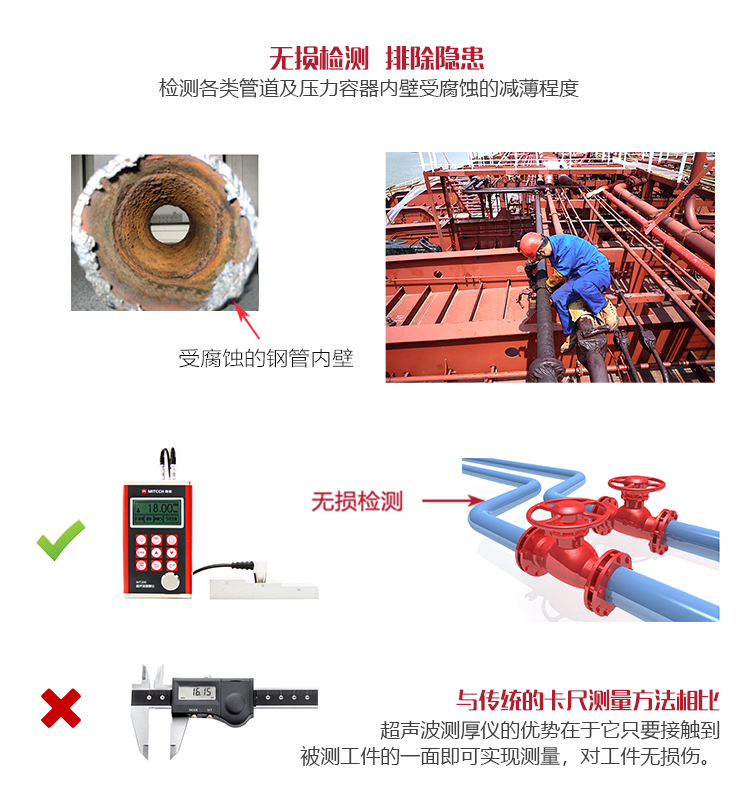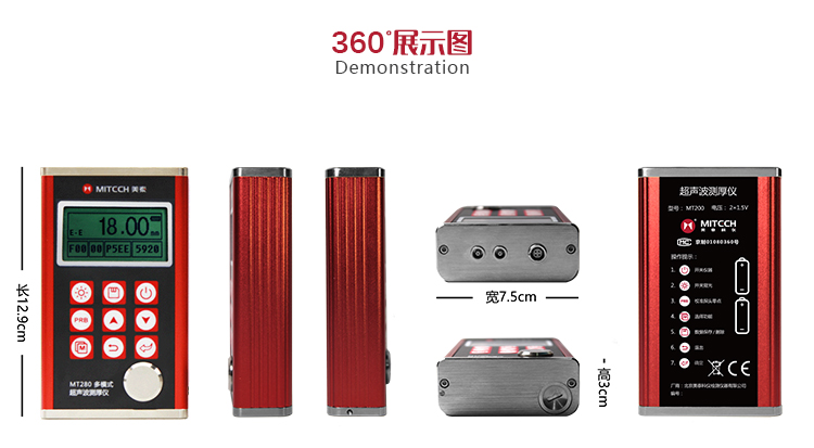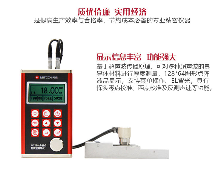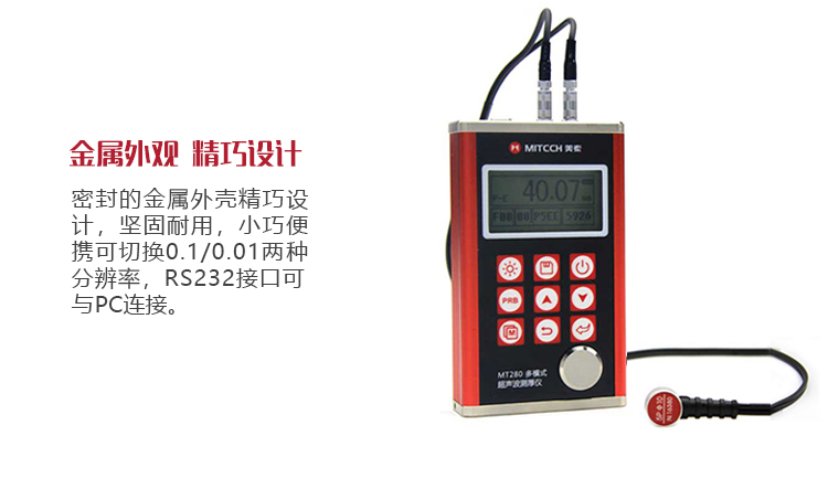產(chǎn)品概述MT280超聲波測(cè)厚儀,基于超聲波測(cè)量原理,可對(duì)金屬、塑料、陶瓷、玻璃及其他多種超聲波的良導(dǎo)體材料進(jìn)行厚度測(cè)量,也可實(shí)現(xiàn)對(duì)材料聲速的反測(cè)。密封的金屬外殼精巧設(shè)計(jì),可防御惡劣現(xiàn)場(chǎng)環(huán)境中的油污、粉塵;與傳統(tǒng)的測(cè)量方法相比,超聲波測(cè)厚儀的優(yōu)勢(shì)在于它只要接觸到被測(cè)工件的一面即可完成測(cè)量,其獨(dú)特的無(wú)損檢測(cè)性能為封閉類管材、容器等厚度檢測(cè)受局限的工況提供了完美的解決方案。MT280兼?zhèn)浯┩竿繉幽J脚c普通模式雙效功能,測(cè)量前無(wú)需處理掉表面的涂層,可直接測(cè)量。被廣泛應(yīng)用于石油、化工、冶金、造船、航空、航天等領(lǐng)域的生產(chǎn)設(shè)備中各種管道及壓力容器腐蝕減薄程度的監(jiān)測(cè),也可用于對(duì)各種板材及各種加工零件做精確的測(cè)量。是提高生產(chǎn)效率與合格率、節(jié)約成本必備的專業(yè)精密儀器。