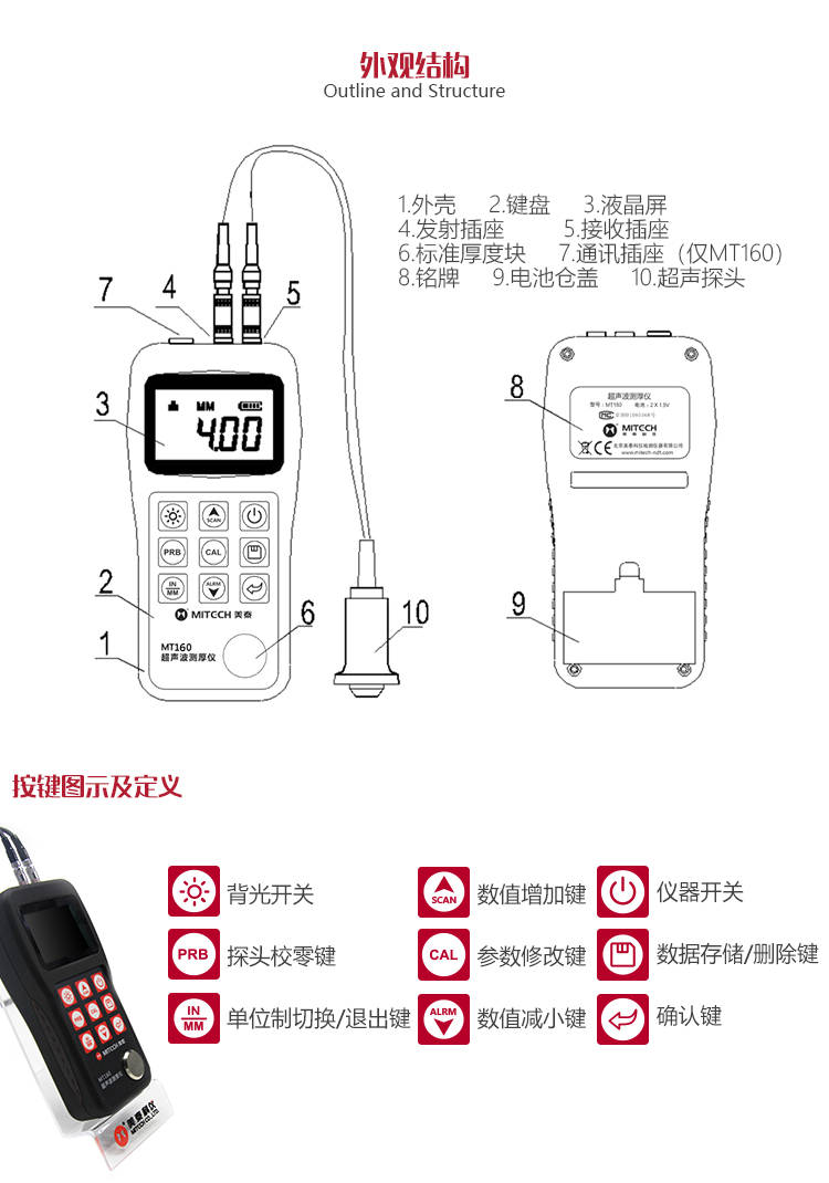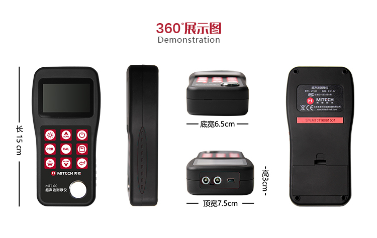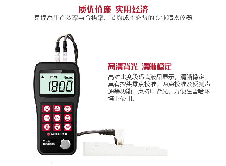 產(chǎn)品概述美泰MT160超聲波測(cè)厚儀,基于超聲波測(cè)量原理,可對(duì)金屬、塑料、陶瓷、玻璃及其他多種超聲波的良導(dǎo)體材料進(jìn)行厚度測(cè)量,也可實(shí)現(xiàn)對(duì)材料聲速的反測(cè)。與傳統(tǒng)的測(cè)量方法相比,超聲波測(cè)厚儀的優(yōu)勢(shì)在于它只要接觸到被測(cè)工件的一面即可完成測(cè)量,其獨(dú)特的無(wú)損檢測(cè)性能為封閉類管材、容器等厚度檢測(cè)受局限的工況提供了完美的解決方案,被廣泛應(yīng)用于石油、化工、冶金、造船、航空、航天等領(lǐng)域的生產(chǎn)設(shè)備中各種管道及壓力容器腐蝕減薄程度的監(jiān)測(cè),也可用于對(duì)各種板材及各種加工零件做精確的測(cè)量。