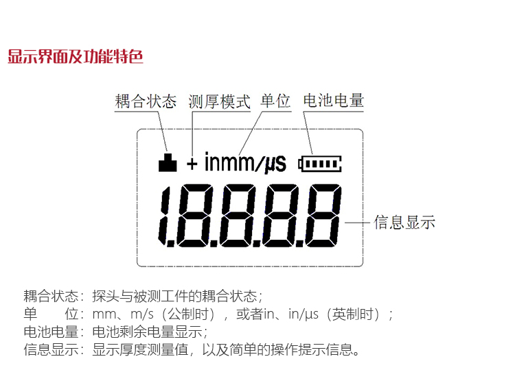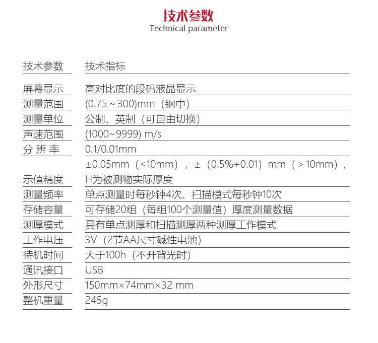 | 測(cè)量范圍 | (0.75~300)mm(鋼中),公制與英制可選擇 |