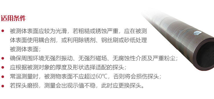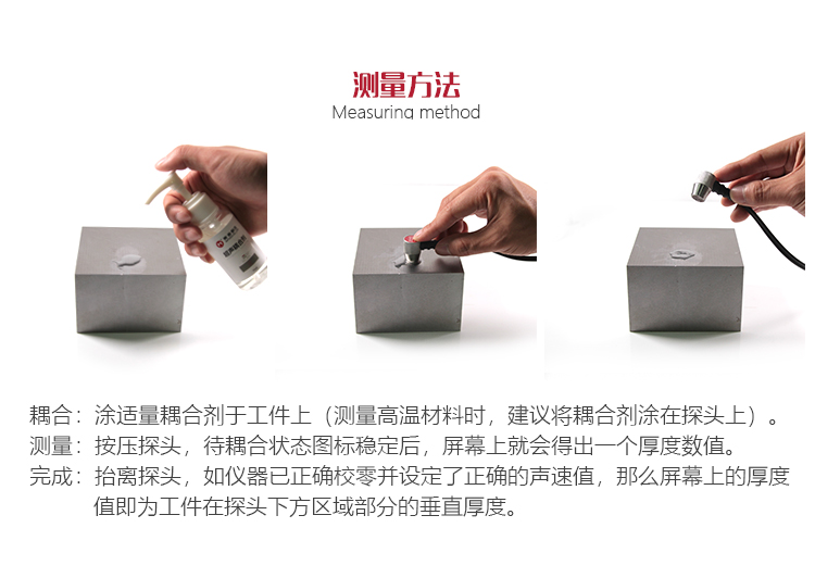厚度測(cè)量將耦合劑均勻涂于被測(cè)區(qū)域,將探頭與被測(cè)材料表面緊密耦合,屏幕將顯示被測(cè)區(qū)域的測(cè)量厚度。當(dāng)探頭與被測(cè)材料良好耦合時(shí),屏幕將顯示耦合標(biāo)志,如果耦合標(biāo)志閃爍或無(wú)耦合標(biāo)志則表示耦合狀況不好。移開探頭后,耦合標(biāo)志消失,厚度值保持。測(cè)量中注意事項(xiàng)