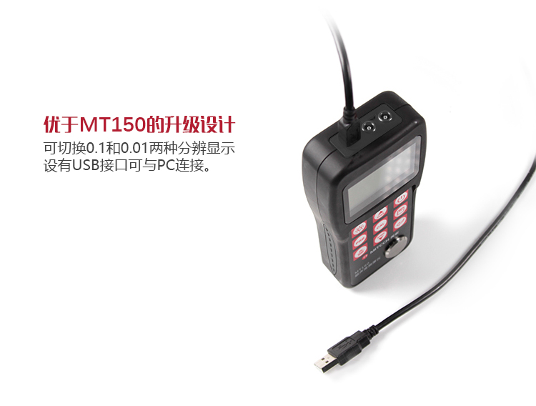 可存儲(chǔ)20組(每組最多100個(gè)測(cè)量值)厚度測(cè)量數(shù)據(jù);USB1.1接口,可與PC機(jī)連接