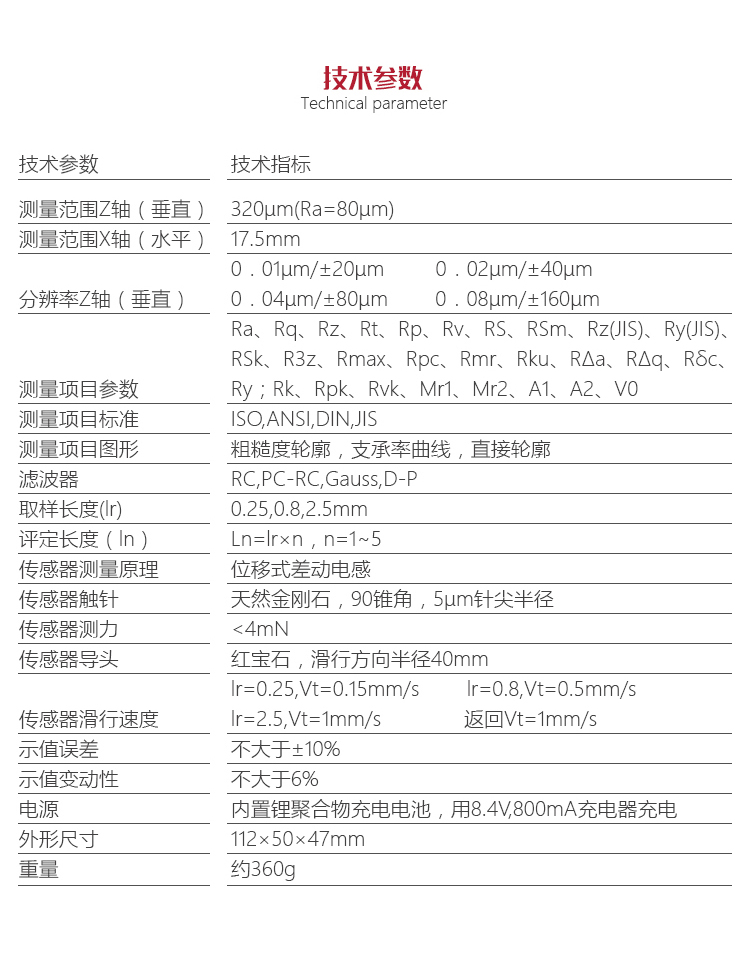 | 傳感器 | 測(cè)量原理:位移式差動(dòng)電感.觸針:天然金剛石,90錐角,5μm針尖半徑.測(cè)力:<4mN.導(dǎo)頭:紅寶石,滑行方向半徑40mm. |