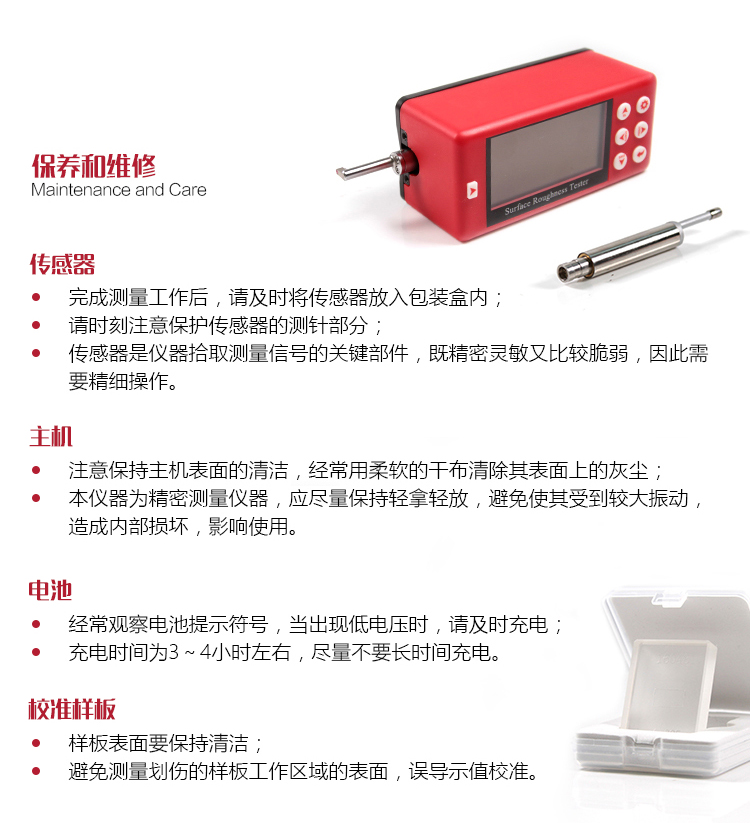| 美泰便攜式粗糙度儀MR200校準(zhǔn)樣板,屬本儀器的標(biāo)準(zhǔn)配置,用于校準(zhǔn)儀器的示值,標(biāo)準(zhǔn)粗糙度校驗(yàn)區(qū)域在樣板的中部。使用校準(zhǔn)樣板校準(zhǔn)時(shí),若實(shí)際測(cè)量值超出樣板標(biāo)定值的±10%,或?qū)y(cè)量精度要求較高時(shí),應(yīng)使用示值校準(zhǔn)功能按照實(shí)際偏差的百分?jǐn)?shù)進(jìn)行校準(zhǔn),校準(zhǔn)范圍不應(yīng)大于±20%。通常情況下,儀器在出廠前都經(jīng)過嚴(yán)格的測(cè)試,示值誤差遠(yuǎn)小于±10%,此時(shí)建議用戶不要頻繁使用示值校準(zhǔn)功能。如將示值校準(zhǔn)數(shù)值設(shè)定為“00”,確認(rèn)后,將恢復(fù)出廠設(shè)定。樣板表面要保持清潔,避免劃傷樣板工作區(qū)域的表面,劃傷或磨損的樣板會(huì)誤導(dǎo)示值校準(zhǔn)。 | |