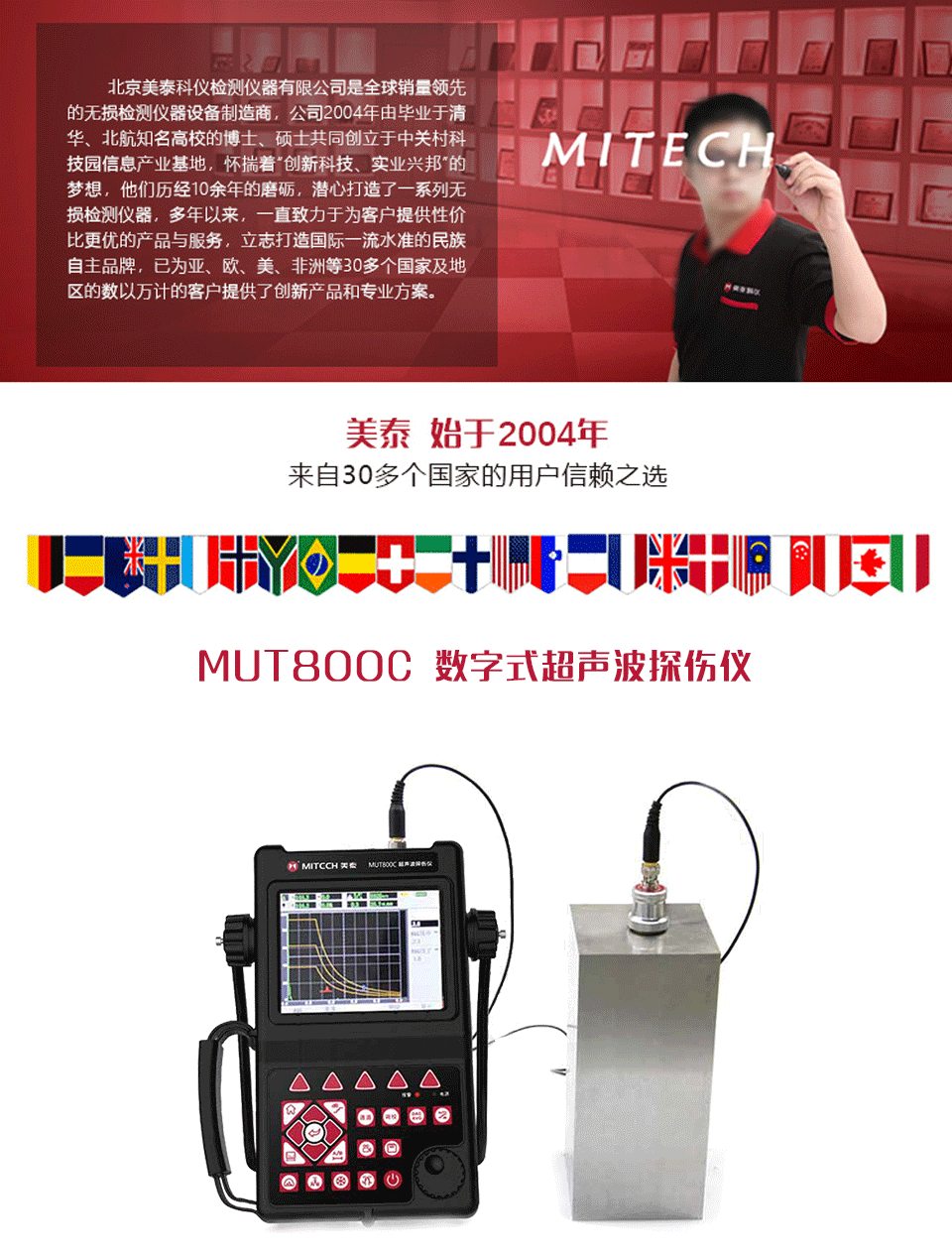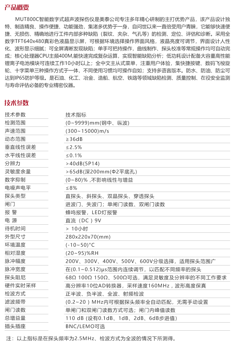 產(chǎn)品概述MUT800C智能數(shù)字式超聲波探傷儀是美泰公司專注多年精心研制的主打優(yōu)勢產(chǎn)品,該產(chǎn)品設計獨特、制造精良、操作便捷、功能強勁,集諸多優(yōu)勢于一身,自問世以來一直倍受用戶親睞,它能夠快速便捷、無損傷、精確地進行工件內部多種缺陷(裂紋、夾雜、氣孔等)的檢測、定位、評估和診斷。采用全數(shù)字TFT 640×480真彩色液晶顯示屏,可根據(jù)環(huán)境選擇操作界面風格,液晶亮度可調節(jié),界面設計人性化、波形顯示細膩;可全屏清晰發(fā)現(xiàn)缺陷;單手可把持操作,曲線制作、探頭校準等常規(guī)操作均可自動完成;核心處理器CPU主頻400M,能快速完成復雜運算,實現(xiàn)智能缺陷分析;低功耗設計配備大容量高性能鋰離子電池模塊可連續(xù)工作10小時以上;全中文主從式菜單,注重用戶體驗,集快捷按鍵、數(shù)碼飛梭旋輪、十字菜單三種操作方式于一體,不同使用習慣均可操作自如;支持多語言版本。防水、防油、防塵可達到IP65防護等級。是石油、化工、冶金、造船、航空、鐵路等領域缺陷檢測、質量控制、在役安全監(jiān)測與壽命評估必備的專業(yè)精密儀器。