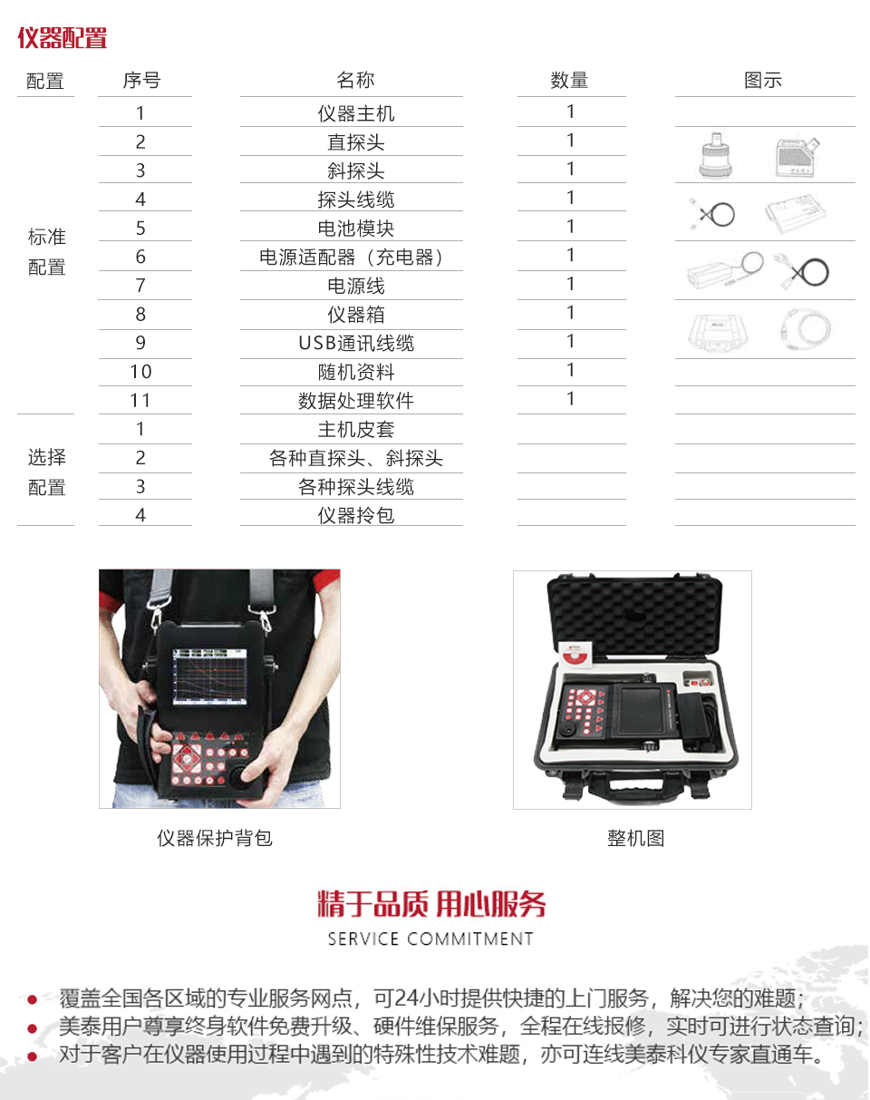 | 美泰超聲波探傷儀附有專用的隨機裝箱資料。包括產(chǎn)品合格證、保修卡、產(chǎn)品說明書、裝箱清單。隨機資料采用專用的銅版紙印制,說明書圖文設計,美觀、易懂、便于長久保存。注:美泰品牌系列產(chǎn)品的隨機資料均可登陸www.zg6899.com下載電子版。 | |