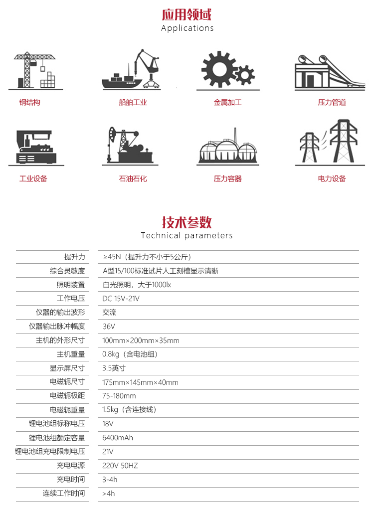 ?新型電源模式的應(yīng)用,使本產(chǎn)品不論在檢測缺陷的深度還是在檢測表面的靈敏度方面都得到了提升;